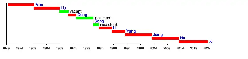 Începând cu anul 1993, în afară de o scurtă perioadă de tranziție, liderul chinez deține în același timp funcțiile de președinte, lider al partidului (ca Secretar General) și comandant-șef al armatei (ca președinte al Comisiei Militare Centrale). Această persoană efectuează diferite sarcini sub aceste titluri distincte. De exemplu, liderul se întâlnește cu demnitari străini și primește ambasadori în calitatea sa de președinte, emite directive militare în calitate de Președinte al Comisiei Militare Centrale și menține puterea partidului ca secretar general al Partidului Comunist Chinez (PCC).