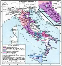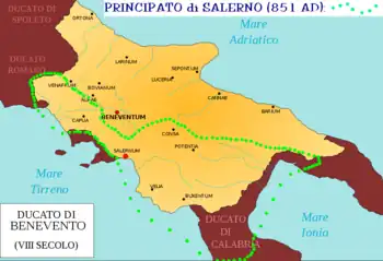 În anul 841 principele Sicard de Benevento s-a stins din viață. Imediat după aceea, conducătorul armatei sale, Radelchis, a preluat puterea în Benevento și l-a închis pe fratele și moștenitorul lui Sicard, Siconulf, în Taranto. Niște negustorii din Amalfi l-au salvat pe Siconulf eliberându-l, după care a fost proclamat ca principe în Salerno. Un rpzboi civil a izbucnit în sudul Italiei. În 847, împăratul Lothar I i-a delegat pe ducii Guy I de Spoleto și Sergiu I de Neapole să intermedieze o divizare a marelui principal longobard. După aceea, în 849, împăratul următor, Ludovic al II-lea, pe atunci rege al Italiei, a stabilit împărțirea principatului de Benevento în două diviziuni: una cu capitala la Salerno iar cealaltă la Benevento.