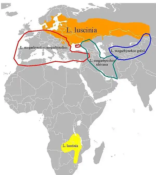 - Portenko, L. A. and Wunderlich, K. (1977). Luscinia luscinia In Dathe, H (ed) Atlas der Verbreitung Palaearktischer Vögel 6. Berlin.
