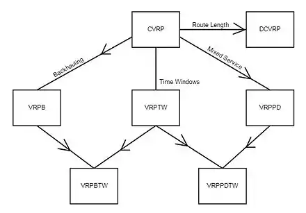 - Problema rutării vehiculelor cu LIFO: Similar cu VRPPD, cu excepția unei restricții suplimentare la încărcarea vehiculelor: în orice loc de livrare, articolul livrat trebuie să fie articolul care a fost încărcat cel mai recent. Această schemă reduce duratele de încărcare și descărcare în locurile de livrare deoarece nu este nevoie de o descărcare temporară a articolelor care nu trebuie descărcate imediat.