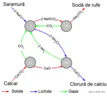 Bicarbonatul de sodiu (NaHCO3) care precipită în reacția (1) este filtrat de soluția fierbinte de clorură de amoniu (NH4Cl), iar soluția de clorură se pune în reacție cu varul nestins (CaO) rămas de la calcinarea calcarului din etapa (2).