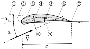 - Unghiul de incidență (unghiul de atac) (α). Este unghiul la care este poziționat profilul față de direcția generală de curgere a fluidului.[1]