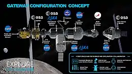 Lunar Gateway este o mini-stație spațială aflată deocamdată în dezvoltare, care urmează să fie plasată pe o orbită lunară destinată să servească drept centru de comunicații alimentat cu energie solară, laborator științific, modul de locuire pe termen scurt pentru astronauții agențiilor guvernamentale, precum și zonă de depozitare pentru rovere.[16] În timp ce proiectul este condus de NASA, Gateway este menit să fie dezvoltat, întreținut și utilizat în colaborare cu parteneri comerciali și internaționali: Canada (Agenția Spațială Canadiană) (CSA), Europa (Agenția Spațială Europeană) (ESA) și Japonia (JAXA).