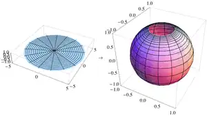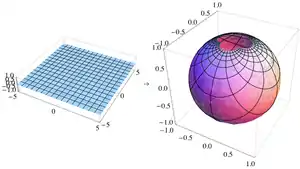 În spațiul tridimensional sfera unitate S' este mulțimea punctelor (x, y, z) care satisfac relația Fie punctul polul nord și restul sferei. Planul trece prin centrul sferei, iar ecuatorul este intersecția sferei cu acest plan.