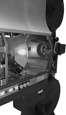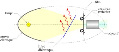 Lumina emisă de sursă este captată de o oglindă sferică, care redirijează razele luminoase către fereastra de proiecție unde întâlnesc filmul străbătându-l ducându-se către ecran prin obiectivul de proiecție. De remarcat că pentru a reduce cantitatea de căldură emanată de sursă, razele luminoase trec inainte de fereastra de proiecție printr-un filtru caloric.