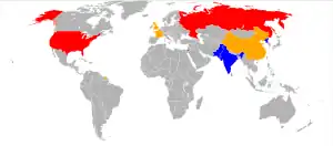 În vederea prevenirii acestui fenomen, la 1 iulie 1968, a fost redactat Tratatul de neproliferare a armamentului nuclear care a fost semnat de ulterior de 188 de state. Acest tratat permite următoarelor cinci state deținerea armelor nucleare: Franța, Republica Populară Chineză, Uniunea Republicilor Sovietice Socialiste (Rusia), Regatul Unit al Marii Britanii și Irlandei de Nord și Statele Unite ale Americii. Acestea au fost singurele state care posedau acest tip de armament la momentul în care tratatul a fost deschis spre semnare și reprezintă cei cinci membri permanenți ai Consiliului de Securitate al Națiunilor Unite (United Nations Security Council). Două (India și Pakistan) din cele opt puteri nucleare confirmate (altfel spus, cele care au testat, în mod public, armament nuclear) și o putere nucleară neconfirmată (Israel) nu au semnat și nici nu au ratificat tratatul. O altă putere nucleară (Coreea de Nord) s-a retras.