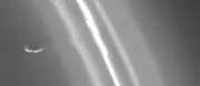 Prometheus slowly collides with the diffuse inner edge of Saturn's F ring ... pulls a streamer of material from the ring and leaves behind a dark channel.