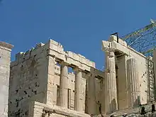 Prin extensie, termenul se aplică la orice colonadă monumentală de la intrarea unui templu sau a unui palat, formată din mai multe porți legate între ele cu porticuri și scări.[3]
