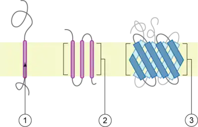 Reprezentare schematică a proteinelor transmembranare: 1) proteină α-helix cu trecere unică; 2) proteină α-helix cu trecere multiplă; 3) proteină tip foi β cu trecere multiplă.