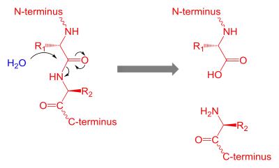 Hidroliza proteinelor (roșu) ca urmare a atacului nucleofil al apei (albastru). Reacția necatalizată are loc în sute de ani.