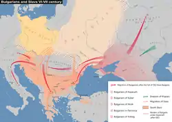 - și în cele din urmă, majoritatea protobulgarilor occidentali s-au stabilit în bazinul inferior al Dunării, unde au fondat Hanatul Bulgar al Dunării, strămoșul actualei Bulgaria.
