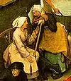 Pelerina albastră, titlul original al picturii, apare în centrul tabloului și este așezată pe un bărbat de către soția sa, ceea ce indică faptul că ea îl înșeală. Alte proverbe indică nebunia umană. Un bărbat umple un iaz după ce i-a murit vițelul. Chiar deasupra figurii centrale a bărbatului îmbrăcat în albastru, un alt bărbat poartă lumina zilei într-un coș. Unele dintre personaje par să reprezinte mai mult de o figură de stil (dacă aceasta era intenția lui Bruegel sau nu, este un lucru necunoscut), cum ar fi bărbatul care tunde o oaie în partea din stânga jos a imaginii. El stă alături de un bărbat care tunde un porc, deci reprezintă expresia „Unul taie oaia și unul porci”, ceea ce înseamnă că unul are un avantaj față de celălalt, dar poate reprezenta și un sfat „Taie-le, dar nu le lua pielea”, adică valorifică la maximum activele disponibile.