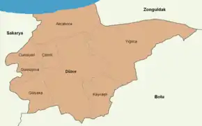 Duzce este divizată în 8 districte (capitala districtului este subliniată):
