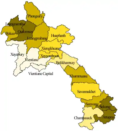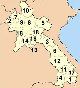 Laosul este împărțit în provincii (în laoțiană ແຂວງ, pronunțat [kʰwɛ̌ːŋ], khoeng, qwang sau khoueng) și o prefectură (kampheng Nakhon) plus capitala Vientiane (ນະ ຄອນ ຫຼວງ, Nakhon Louang sau Na Kone Luang Vientiane). Zona specială administrativă (ເຂດ ພິ ເສດ, Khet phiset), Xaisomboun, creată în 1994, a fost dizolvată la 13 ianuarie 2006.[1]