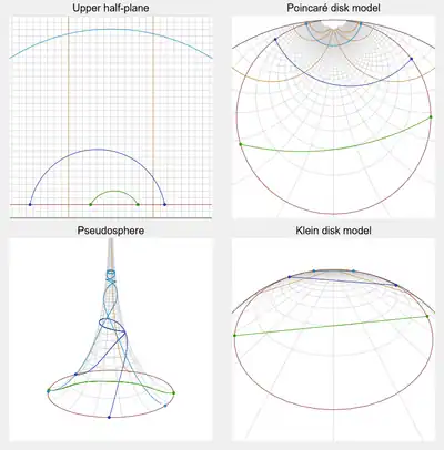 (Sau și în it Beltrami, Eugenio. Opere Matematiche. 1. pp. 374–405. ISBN 1-4181-8434-9., sau în fr Beltrami, Eugenio (). „Essai d'interprétation de la géométrie noneuclidéenne”. Annales de l'École Normale Supérieure. 6: 251–288. Arhivat din original la . Accesat în .) - en Bonahon, Francis (). Low-dimensional geometry: from Euclidean surfaces to hyperbolic knots. AMS Bookstore. p. 108. ISBN 0-8218-4816-X., Chapter 5, page 108