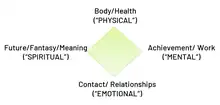 Deși aceste patru domenii sunt inerente tuturor oamenilor, societățile occidentale tind să acorde prioritate domeniilor de bunăstare fizică și succes profesional, în timp ce tările estice pun un accent mai mare pe conexiunile interpersonale, imaginația și aspirațiile viitoare (un aspect transcultural al psihoterapiei pozitive). Se știe că un contact insuficient și lipsa de imaginație contribuie la diverse boli psihosomatice.