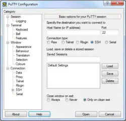 ![]() fereastră principală de configurare PuTTY sub Windows | |