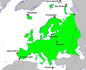 1 Dacă Țara Franz Josef nu e considerată ca făcând parte din Europa, atunci cel mai nordic punct la Rossoya, Svalbard (81°N).
