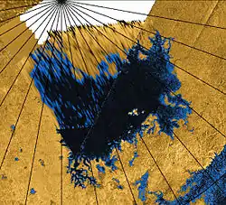 Punga Mare într-un mozaic de culori false, imagini capturate prin radar de apertură sintetică din regiunea polară nordică a satelitului Titan. O parte din nordul lacului Kraken Mare se vede în imagine în dreapta jos | |