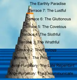 - Șapte ocoluri ce simbolizează păcatele (trufia, invidia, mânia, trândăvia, zgârcenia, lăcomia, desfânarea)