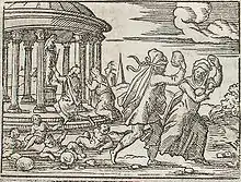 Deucalion și soția sa, Pyra. În planul doi, ei primesc oracolul zeiței Themis iar în primul plan sunt reprezentați aruncând pietre care devin copii (gravură de Virgil Solis (1514 - 1562), gravor german, pentru Metamorfoze de Ovidiu).
