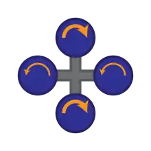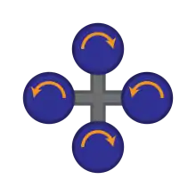 | Schema cuplurilor de reacție pe fiecare motor al unei aeronave quadcopter, datorită rotației. Rotoarele 1 și 3 se rotesc într-o direcție, în timp ce rotoarele 2 și 4 se rotesc în direcția opusă, dând momente opuse pentru control. | ||