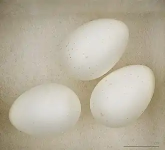 Ouăle sunt de un alb strălucitor, cu câteva pete maronii; de obicei, există trei ouă într-un cuib. Incubarea se face numai de către femelă timp de 14-16 zile până la eclozare. Ambii părinți hrănesc apoi puii. Penele cresc în 20-21 de zile, iar după primul zbor, păsările tinere se vor întoarce la cuib pentru a se adăposti.