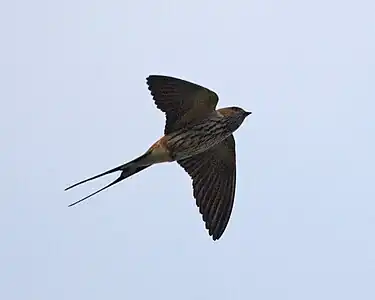 Rândunica cu dungi are 10–15 cm lungime. Părțile superioare au culoarea albastru-închis iar coroana, ceafa și părțile laterale ale capului sunt de un brun-roșcat. Părțile inferioare sunt albe, cu dungi întunecate, iar aripile superioare și penele de zbor sunt maro-închis. Penele de sub aripi sunt brune. Coada negricioasă are pene foarte lungi, care sunt mai lungi la mascul decât la femelă. Puii sunt mai șterși și au o nuanță mai maronie, împreună cu pene mai scurte ale cozii. Există cinci sau șase subspecii care diferă ca nuanță pe partea inferioară.
