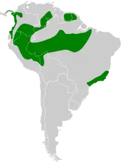 Se găsește în Bolivia, Brazilia, Columbia, Ecuador, Guyana Franceză, Panama, Peru, Surinam și Venezuela. Habitatul său natural sunt pădurile de câmpie umede subtropicale sau tropicale.