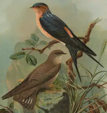 1. (sus) Rândunica roșcată (Cecropis daurica, supspecia rufula); 2. (jos) Lăstunul de stâncă (Ptyonoprogne rupestris) după Naumann
