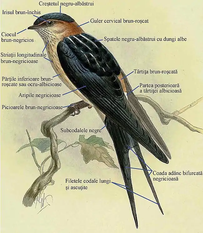 Are o lungime de 16-17 cm și o greutate 19-29 g. Longevitatea maximă este de 8-9 ani. Sexele sunt asemănătoare după culoarea penajului, dar femela are coada mai scurtă decât masculul. Se recunoaște după coloritul distinctiv al penajului. Subspecia nominată (Cecropis daurica daurica) are creștetul și spatele albastru-închise, spatele este separat de cap de un guler cervical incomplet castaniu (brun-roșcat), târtița este castanie (brun-roșcată) cu dungi (striații) fine de culoare închisă. Aripile și coada sunt negricioasă cu un oarecare luciu, rectricele laterale ale cozii (filetele cozii) sunt alungite. Părțile inferioare brun-gălbui, cu striații lungi intunecate, penele subcodale negre. Tectricele subalare brun-gălbui cremoase. Subspecia rufula are părțile inferioare brun-roșcat deschise, striații înguste și un guler complet. Seamănă cu rândunica, dar pieptul roșcat are ușoare striații longitudinale; târtița și dosul gâtului sunt cărămizii (brun-roșcate), subcodalele negre (albe la rândunică).[7][8][9][10][11]