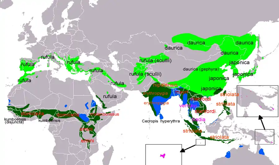 - Cecropis daurica striolata (Schlegel, 1844) - rândunică striată - cuibărește în Taiwan, Filipine, insulele Sondele Mari și Sondele Mici, la est până în Wetar și Timor.