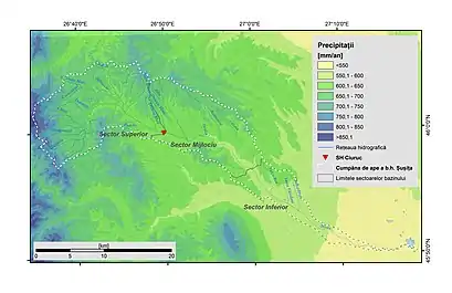 Hidrografic, bazinul este monitorizat în stația hidrometrică Ciuruc, ce acoperă aproximativ 50% din suprafața bazinului, ce corespunde sectoarelor montane si subcarpatice interne. La postul hidrometric Ciuruc, debitul mediu multi-anual este de 1.365 m³/s, cu extreme situate între un minim de 0 m³/s (februarie 1964) și un maxim de 550 m³/s (iunie 1991).