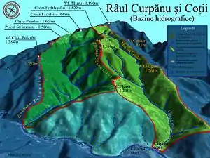 ![]() Bazinul hidrografic al Curpănului (verde închis) alături de Bazinul Râului Coții (verde deschis) | |