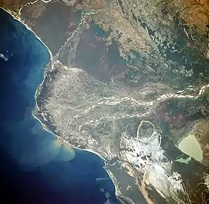 Mangoky, așa cum demonstrează numeroasele bariere de nisip situate în canalul râului. Lacul Ihotry încărcat de nămol, de culoare verzuie, este clar vizibil la sud de râu. Între lac și coastă se află o zonă destul de mare, albicioasă, de nisip, presărată cu iazuri încărcate de mâl. Porțiunea de sud a deltei este dominată de formarea succesivă a barierei de nisip. În schimb, partea de nord, protejată a deltei, este dominată de trecători de maree și mlaștini cu mangrove.
