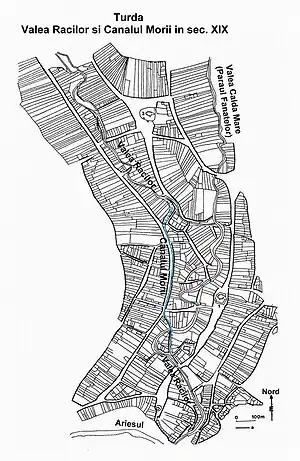 - Alte toponime locale pentru “Valea Racilor”: Pârâul Racilor, Valea Rachiș, Valea Racoșei, Valea Copăceni, Valea Copandului, Pârâul Copăcenilor, Valea Morii, Valea Turului, Valea Turenilor. Valea Morii își adună apele de sub culmea Făgetului Clujului și ține până în apropierea satului Mărtinești, de unde se continuă sub numele de Valea Turenilor sau Valea Turului, iar după intrarea în Turda este folosită denumirea Valea Racilor. Se varsă la Turda în Arieș, în aval de fostul abator.
