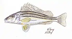 Are corpul alungit cu fruntea aplatizată dându-i aspect de cioc de gâscă. Solzii mărunți sunt brun-deschis la culoare, cu frumoase irizații aurii. Partea dorsală și flancurile sunt galbene, cea ventrală aproape albă. Pe jumătatea dorsală a corpului se întind trei dungi longitudinale negru-albăstrui, subțiri și bine delimitate. Înotătoarele sunt de culoarea corpului, dorsal are două, prima cu radii țepoase și punctată cu negru[3]. Greu de confundat cu speciile înrudite datorită desenului longitudinal[4]. Atinge maturitatea sexuală la vârsta de 2–3 ani și 12–16 cm (lungimea standard). Se reproduce în perioada aprilie–mai întreprinzând migrații în susul râurilor pe distanțe mici în grupuri foarte numeroase spre locurile de depunere. Fiecare femelă depune icrele în prezența mai multor masculi, pe substrat tare, în curent, sub formă de benzi.