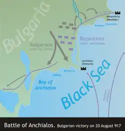 La scurt timp după ce Simeon a vizitat Constantinopolul, mama lui Constantin, Zoe, s-a întors la palat la insistența tânărului împărat și a trecut imediat la eliminarea regenților. Printr-un complot, ea a reușit să-și asume puterea în februarie 914, practic îndepărtându-l de la guvernare pe Patriarhul Nicolae, acuzându-l de acordarea titlului imperial lui Simeon și respingând căsătoria planificată a fiului ei cu una dintre fiicele lui Simeon. Ca represalii, Simeon a invadat Tracia în vara anului 914 și a asediat și a cucerit Adrianopolul. În 917, o armată bizantină deosebit de puternică condusă de Leon Focas, fiul lui Nicefor al II-lea Focas, a invadat Bulgaria însoțit de marina bizantină sub comanda lui Roman I Lecapenos, care a navigat în porturile bulgare din Marea Neagră. În drum spre Mesembria (Nesebǎr), unde trebuiau să primească întăriri de la trupele transportate de armată, forțele lui Focas s-au oprit să se odihnească lângă râul Acheloos, nu departe de portul Anchialos (Pomorie). Odată informat despre invazie, Simeon s-a grăbit să-i prindă pe bizantini și i-a atacat de pe dealurile din apropiere, în timp ce aceștia se odihneau dezorganizați. În bătălia de la Achelous (sau Anchialus) din 20 august 917, una dintre cele mai mari din istoria medievală, bulgarii i-au învins decisiv pe bizantini și i-au ucis pe mulți dintre comandanții lor, deși Phokas a reușit să scape în Mesembria. Ca urmare a victoriei, Simeon s-a aliat cu pecenegii și a început o ofensivă majoră împotriva teritoriilor europene ale bizantinilor. Bulgarii trimiși să urmărească rămășițele armatei bizantine s-au apropiat de Constantinopol și au întâlnit forțele conduse de Leon Focas, care se întorcea în capitală, în satul Katasyrtai, în imediata apropiere a Constantinopolului.[19] După o încleștare nocturnă, bizantinii au suferit pierderi grele pe câmpul de luptă.