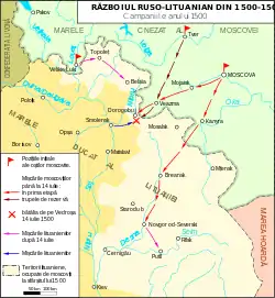 Moscoviții au înaintat rapid peste forțele lituaniene la Breansk, Veazma,[11] Dorogobuj(en)[traduceți], Toropeț, Putîvl.[12] Nobilii locali, dintre care familia Vorotînski(en)[traduceți], s-au raliat adesea cauzei moscovite. Un alt atac a venit dinspre sud-est în voievodatul Kievului(en)[traduceți], Volînia și Podolia.[10] La 14 iulie 1500, lituanienii au suferit o grea înfrângere în bătălia de pe râul Vedroșa(en)[traduceți]; marele hatman(en)[traduceți] Konstanty Ostrogski(en)[traduceți] a căzut prizonier. Înfrângerea a fost unul din motivele pentru care s-a propus Uniunea de la Mielnik(en)[traduceți] între Polonia și Lituania.[13] În noiembrie 1501, lituanienii au fost din nou înfrânți în bătălia de la Mstislavl(en)[traduceți]. Tătarii crimeeni au distrus Hoarda de Aur, aliat al Lituaniei, cucerind capitala, Noul Sarai, în 1502.[14]