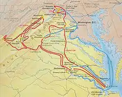 Forțele unioniste din est au încercat să îl ocolească pe Lee și au dus câteva bătălii în această fază a campaniei din est. Bătăliile de uzură ale lui Grant de la Wilderness, Spotsylvania, și Cold Harbor[88] au avut ca rezultat pierderi mari în rândurile unioniștilor, dar i-au forțat pe confederații lui Lee să se retragă din ce în ce mai mult. O tentativă de a lui Butler a-l depăși pe Lee pe flancuri a eșuat. Grant, în ciuda pierderilor uriașe (peste 65.000 de morți în șapte săptămâni),[89] a continuat să forțeze armata lui Lee a Virginiei de Nord înapoi înspre Richmond. El a blocat armata confederată în asediul Petersburgului, care a durat nouă luni.