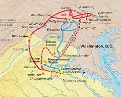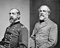 Când prudentul McClellan nu a capitalizat victoria de la Antietam, el a fost înlocuit de general-maior Ambrose Burnside. Burnside a fost învins în curând la bătălia de la Fredericksburg[75] la 13 decembrie 1862, când alți 12.000 de soldați unioniști au fost omorâți sau răniți în timpul repetatelor și inutilelor atacuri frontale de la înălțimile Marye's Heights. După bătălie, Burnside a fost și el înlocuit cu general-maior Joseph Hooker. Nici Hooker nu s-a dovedit capabil să învingă armata lui Lee; deși confederații erau de două ori mai puțini, el a fost umilit în bătălia de la Chancellorsville[76] în mai 1863. El a fost înlocuit de general-maior George Meade în timpul celei de-a doua invazii a lui Lee în Nord, în iunie. Meade l-a învins pe Lee în bătălia de la Gettysburg[77] (1-3 iulie 1863), cea mai sângeroasă bătălie a războiului, considerată uneori ca fiind punctul de cotitură al războiului. Șarja lui Pickett din cadrul acestei bătălii, la 3 iulie este punctul maxim de pătrundere a trupelor confederate pe teritoriul Uniunii, reprezentând semnalul sfârșitului planurilor lui Lee de a pune presiune pe Washington dinspre Nord, dar și pentru că Vicksburg, Mississippi, fortăreața-cheie care asigura controlul asupra râului Mississippi, a căzut a doua zi. Armata lui Lee a suferit 28.000 de pierderi (față de 23.000 în tabăra lui Meade).[78] Totuși, Lincoln s-a supărat pe Meade pentru că nu a interceptat retragerea lui Lee, și după neconcludenta campanie din toamnă a lui Meade, Lincoln a decis să caute pe Teatrul Vestic o nouă conducere.