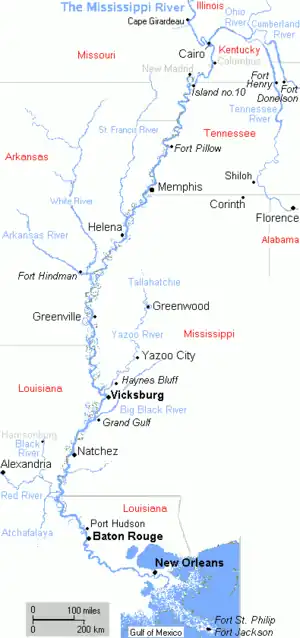 Nashville, Tennessee, a căzut în mâinile Uniunii la începutul lui 1862. Mare parte din râul Mississippi era deschisă în urma bătăliei de la Insula numărul 10 și cele de la New Madrid, Missouri, și apoi Memphis, Tennessee. Marina Uniunii a capturat portul New Orleans[80] fără lupte majore în mai 1862, permițând forțelor Uniunii să se deplaseze și pe râul Mississippi. Doar orașul fortificat Vicksburg, Mississippi, se mai opunea controlului neîngrădit al Uniunii asupra întregului râu.