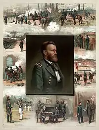 Principalul strateg și tactician unionist din vest a fost Ulysses S. Grant, care a repurtat victorii la forturile Henry și Donelson (prin care Uniunea a preluat controlul asupra râurilor Tennessee și Cumberland); bătălia de la Shiloh;[83] și bătălia de la Vicksburg,[84] care a cimentat controlul unionist al râului Mississippi, moment considerat unul din punctele de cotitură ale războiului. Grant a venit apoi în ajutorul lui Rosecrans și l-a învins pe Bragg în a treia bătălie de la Chattanooga,[85] gonind forțele confederate din Tennessee și deschizând o cale către Atlanta și către inima Confederației.