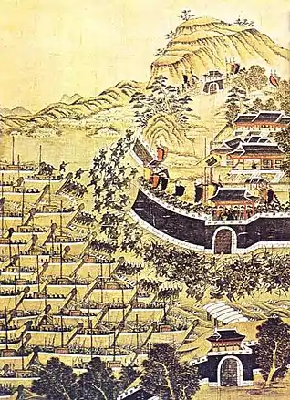 ii conduși de acesta au asediat orașul Busan iar soldații conduși de Konishi Yukinaga au atacat fortăreața Dadaejin din apropiere în dimineața următoare.[79] Sursele japoneze susțin că luptele au dus la anihilarea completă a coreenilor. O sursă susține că au murit 8.500 de oameni iar alta că au murit 30.000 de oameni. Sursele coreene susțin în schimb că japonezii suferiseră pierderi semnificative încă dinainte să înceapă să jefuiască orașul.[81] În dimineața zilei de 25 mai 1592, prima divizie a ajuns la Dongrae eupseong.[81] Lupta a durat douăsprezece ore, 3000 de oameni au murit și s-a încheiat cu victoria japonezilor.[82] (asediul de la Dongnae)