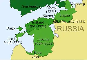 Provincia daneză Øsel a fost cedată Suediei conform tratatului de la Brömsebro din 1645, care a pus capăt Războiului lui Torstenson(en)[traduceți], teatru de operațiuni al Războiului de Treizeci de Ani.[110] Aceasta a fost păstrată și după pacea de la Oliva(en)[traduceți] și prin tratatul de la Copenhaga, ambele din 1660.[111] Situația a rămas neschimbată până în 1710 când Estonia și Livonia au capitulat în fața Rusiei(en)[traduceți] în timpul Marelui Război al Nordului, acțiune oficializată prin tratatul de la Nystad(en)[traduceți] (1721).[112]