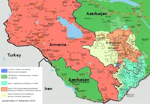 ![]() Situația războiului la 17 decembrie 2020; Teritorii controlate de Republica Arțah Teritorii revendicate de către Arțah, dar controlate de către Azerbaijan Teritorii capturate de către Azerbaijan Cu galben teritoriile cedate de armeni după armistițiu | |||||||||||