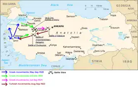 Turcii au lansat contraatacul cunoscut și ca „Buyuk Taarruz” (Marea Ofensivă) pe 26 august. În aceeași zi, principalele poziții defensive elene au fost cucerite, iar a doua zi a fost eliberat orașul Afyon. Armata elenă a fost învinsă definitiv în bătălia de la Dumlupınar pe 30 august. Jumate dintre soldații greci au fost luați prizonieri și o bună parte a echipamentelor militare au fost pierdute pe câmpul de luptă[37]. Ziua de 30 august este sărbătorită ca „Ziua Victoriei” și a eliberării orașului Kütahya. În timpul Bătăliei de la Dumlupınar, turcii au reușit să-i captureze pe generalii greciTrikoupis și Dionis[38]. Generalul Trikoupis avea să afle doar în prizonierat că fusese numit comandant al trupelor elene în locul generalului Hatzianestis. Pe 1 septembrie, Mustafa Kemal a emis ordinul său celebru: „Armată, obiectivul tău general este Mediterane, Înainte!” [37]
