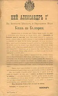- Hertslet, Edward (), „Declaration of War by Bulgaria against Servia, 14 November 1885 (Translation)”, The Map of Europe by Treaty; which have taken place since the general peace of 1814. With numerous maps and notes, IV (1875-1891) (ed. First), London: Her Majesty's Stationery Office, p. 3143, accesat în