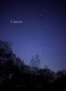 Constelația Racul văzută cu ochiul liber. Pentru identificarea mai ușoară au fost trasate linii între stele.