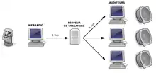 Pentru o emisie de radio on line sunt necesare trei componente principale: sursa de emisie, un server retransmițător (repetitor) de emisie și un player de recepție la ascultător pe un PC.
